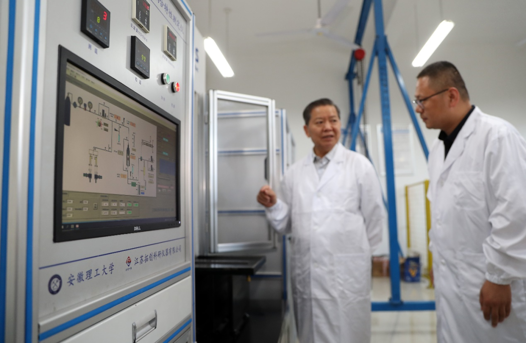 袁亮院士在深部煤矿采动响应与灾害防控国家重点实验室与青年教师一起使用煤与瓦斯突出物理模拟装置开展科研攻关。