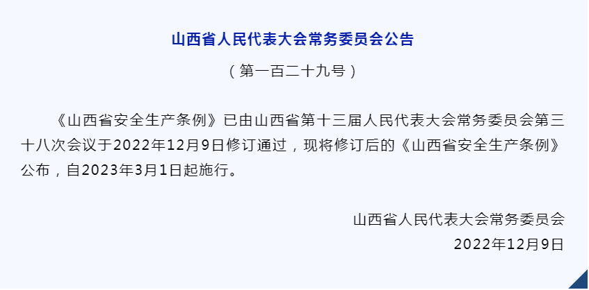 新修订的《山西省安全生产条例》公布,2023年3月1日起施行