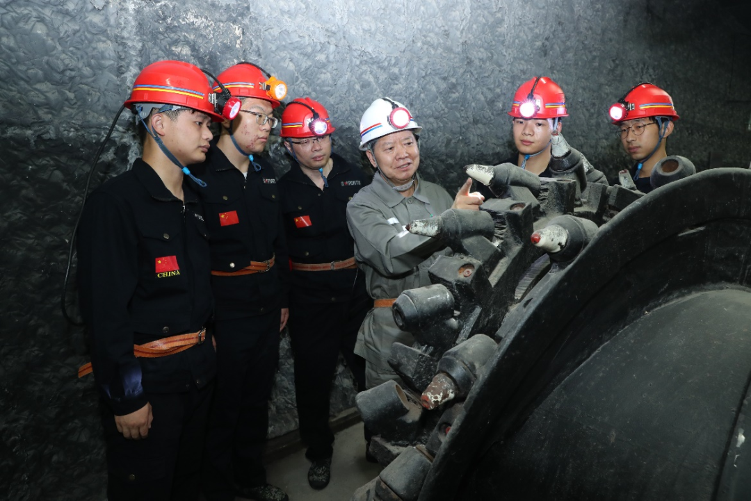 袁亮院士为学生讲解双滚筒采煤机滚筒截齿切割原理和一次采全高工艺技术。